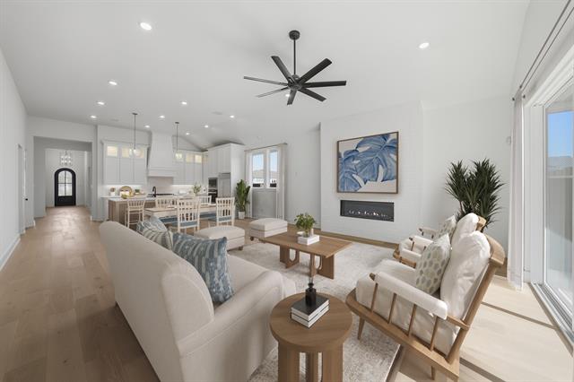If you’re a new family or looking to downsize, this Jolly Floor Plan home is the perfect size. The exterior offers a modern take on a Spanish classic. This one-story home features 12-foot ceilings throughout the living area and a private study that doesn’t take away from the four bedrooms. The kitchen delivers a high-end experience with built-in appliances and quartz countertops. A 12-foot sliding glass door and a centrally placed fireplace add to the home’s inviting atmosphere.