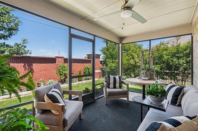 OPEN HOUSES SATURDAY 12pm-2pm and SUNDAY 1pm to 3pm! This 6 year old home in Frisco Lakes features original builder upgrades and newly added improvements. The home still has 4 years left on the foundation warranty. Original upgrades include the more expensive elevation plan featuring Austin stone and elegantly beveled roof lines. Both bathrooms feature real tile rather than fiberglass inserts, extensive tile work throughout with carpet only located in the bedrooms, crown molding, recessed lighting, tray ceilings in both the living and dining area and primary bedroom. Both secondary bedrooms are oversized and feature ample closet space, and the home also has a large screened porch, not included in the Square Footage. Immediate improvements to the home include the hardscaping and softscaping in the front and back yards including mortared Austin stone flower bed edging to match the house, complete with a grill pad and perennial plants throughout. Updated fixtures include lighting, especially the Tiffany style focal feature chandelier in the dining space, new fans and hardware, high end under mount lighting on a switch, new garage door, plumbing and electrical work, paint throughout. This gorgeous house has been re imagined by renowned interior designer, Don Collier, and is perfectly sized for a lock and leave lifestyle. From the striking finishes to the artful use of space, every inch has been curated to inspire and impress. The open-concept floor plan is ideal for hosting and the flow between the kitchen, dining, and living areas makes connection easy and natural. Frisco Lakes residents enjoy numerous events, community wide breakfasts, neighborhood clubs including pickle ball, bocce, wine, card nights, and so many more ways to connect with neighbors and develop a network of friendships. Enjoy the outdoor and indoor pools, multiple full gyms, indoor walking track, fitness classes and more!