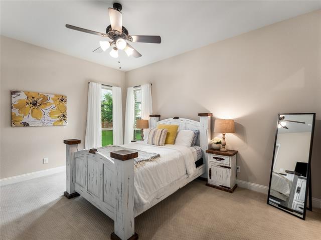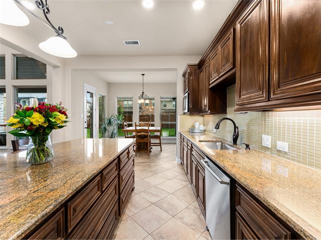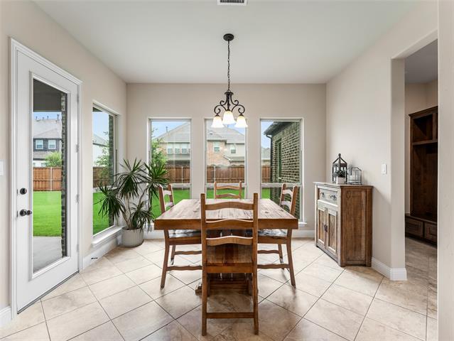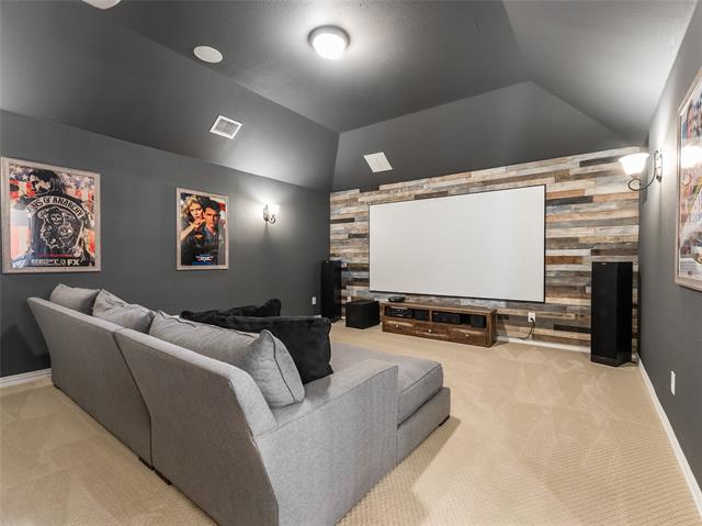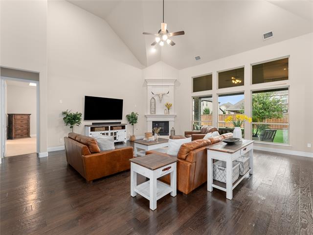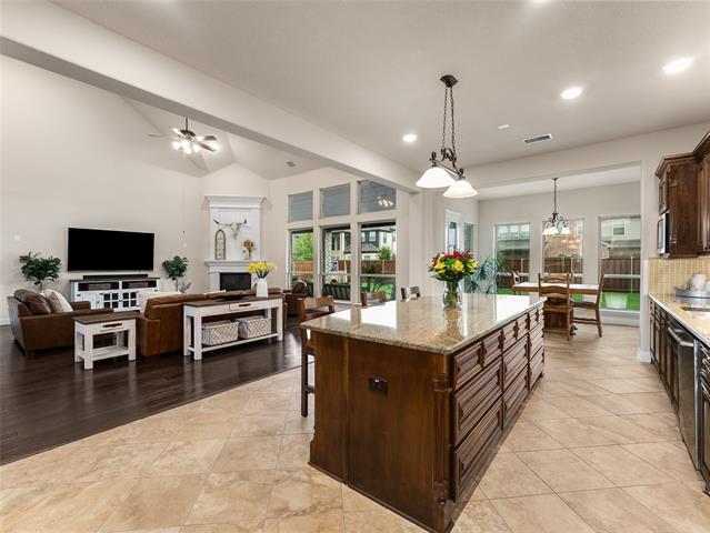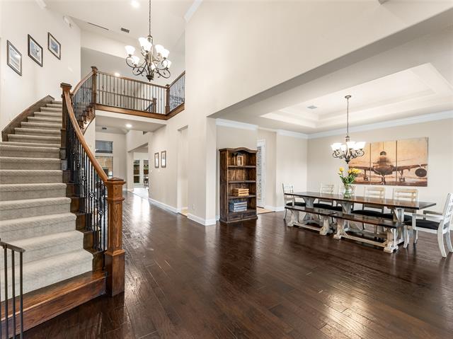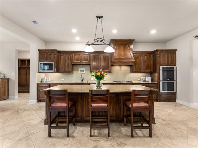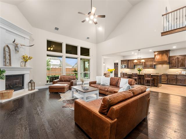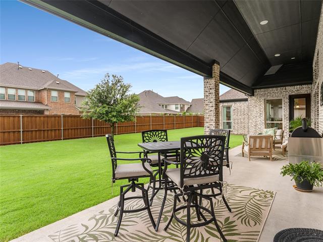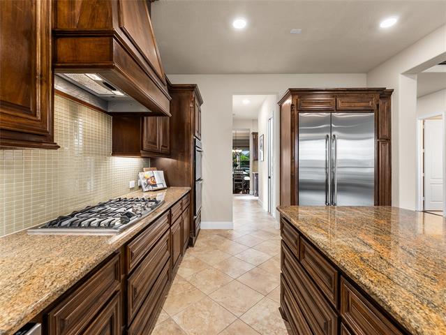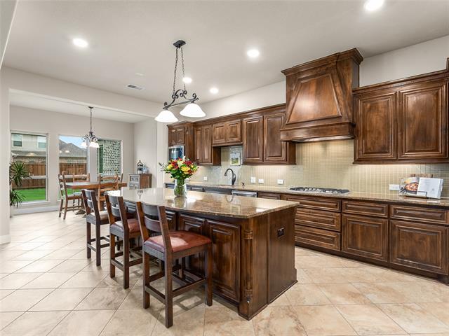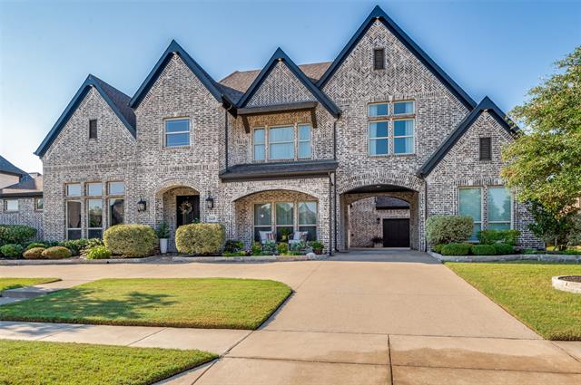 Welcome to this stunning Gallery Custom Home in the desirable Lakes of La Cima community, located within top-rated Prosper ISD. Situated on a spacious 0.333-acre lot, this 5-bedroom, 4.5-bath home offers 5,399 sq ft of luxurious living and a 3-car garage with a porte cochere and circular drive that make a grand first impression. Step through the elegant double iron doors to find rich wood floors, a formal dining room perfect for gatherings, and a dedicated office with soaring tray ceilings. Designed for entertaining, the home features a chef’s dream kitchen with an oversized island (extra storage front and back), built-in refrigerator, gas cooktop, and double convection ovens. You’ll also love the bonus prep kitchen space with gas stub—ideal for future customization. The expansive living room impresses with vaulted ceilings and a cozy gas log fireplace. The private first-floor primary suite offers a serene retreat with a spa-like bath, featuring double vanities, a garden tub, oversized shower, and a massive walk-in closet. Also on the main floor is a generous guest suite with walk-in shower. Unique to this home is a media room located between the first and second floors—perfectly tucked away for movie nights, sports, or gaming without disrupting the main living spaces. Upstairs, you’ll find a large game room, three oversized bedrooms, and two full baths, including another ensuite and a bonus room ideal for play, study, or storage. Enjoy evenings on the expansive covered patio—perfect for outdoor dining, lounging, or future entertaining—overlooking a spacious backyard with plenty of room to play or add a pool. Due to the home's proximity to the nearby fire station, the homeowners never lost power during the 2021 Texas Freeze—offering an added layer of peace of mind. Community amenities include pools, parks, fishing ponds, and trails. A truly exceptional home offering space, style, and comfort in a sought-after neighborhood.