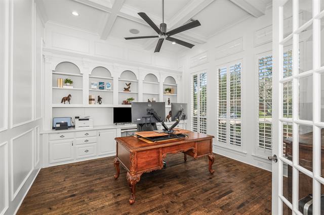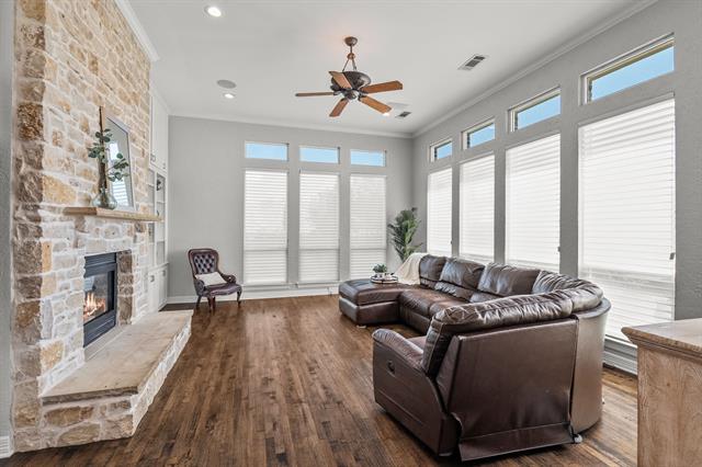 Welcome to your own private oasis, a true backyard paradise featuring a sparkling salt water pool, inviting spa, and generous side yard perfect for outdoor entertaining and play. Whether you're hosting lively summer pool parties or enjoying quiet evenings under the stars, this outdoor retreat is the centerpiece of the home. Inside, discover a meticulously crafted 5-bedroom, 4.5 bathroom home, that seamlessly combines luxury and comfort. This home features, Hardwood floors, custom built-ins, integrated sound speakers, soaring ceilings, and elegant crown molding The formal living and dining rooms are ideally situated for entertaining, featuring a cozy fireplace and a wall of windows that provide views of the backyard. Working from home is a breeze in the dedicated study, complete with French doors, a custom built-in bookcase, and a functional desk space. At the heart of the home is a chef’s dream kitchen, equipped with a premium 8-burner gas cooktop, quartz countertops, glass subway tile backsplash, and a large center island. The adjacent family room includes a second fireplace and custom built-in shelving, making it an inviting space for everyday living. The primary suite, located on the main floor, features a spa-inspired bath with dual vanities, a soaking tub, walk-in shower, and a custom walk-in closet. A separate half bath offers convenient access to the pool and outdoor areas. Upstairs, enjoy a game room and a fully equipped media room complete with built in cabinetry, an electric drop down screen, and projector. Three additional bedrooms each include walk-in closets, with two connected by a Jack-and-Jill bathroom. The fifth bedroom, located privately on the third floor, offers flexible use as a teen retreat, or home office. Located in the prestigious Winding Creek community, with close proximity to restaurants and shopping and access to parks, trails, and playgrounds. Style, space, and substance, this home truly has it all. Dual generators