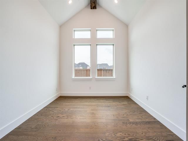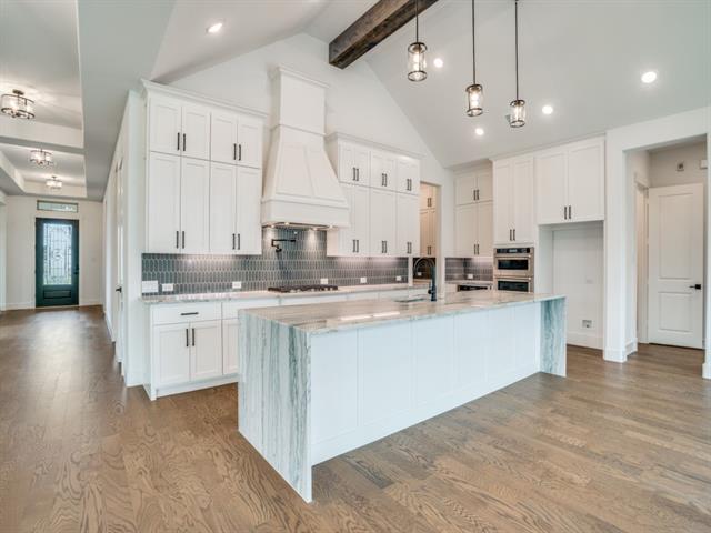 RISLAND HOMES SOFIA floor plan. Welcome home, Neighbor! Stunning curb appeal awaits in this gorgeous one-story home with cream painted brick and coordinating stone elevation nestled perfectly on an interior lot! The roomy front porch comfortably invites guests as they arrive! Entry foyer is nothing short of impressive with tray ceilings to highlight its luxurious feel. Masterpiece study created with you in mind with cathedral ceiling, boxed wood beam, and thoughtfully placed windows for abundant natural light. The Gourmet Kitchen begs for your culinary creativity to shine through with KitchenAid appliances, pot filler, farmhouse sink, and abundant cabinets with under cabinet lighting. Off the main Kitchen, the Morning kitchen is a charming inclusion for possibilities such as a coffee bar or perhaps even a crock pot station and is complete with sink & cabinetry for extra storage! Kitchen, family room, and casual dining are open to each other creating a highly desirable expansive open concept feel. The kitchen and family room share a soaring cathedral ceiling which is tied together with beautiful boxed wooden beam! BBQ like a boss on your oversized covered patio with included gas drop. Tranquility is yours in the owner’s suite with sizeable windows & spacious room size. Oasis-like bath includes super shower tiled from floor to ceiling finished with rainfall shower head & traditional shower head. Hardwood floors are sprawled throughout the home including owner’s suite. All three secondary bedrooms are nicely sized and include private baths. Powder bath is perfect for guests. Enjoy the EV outlet included in the garage for that electric vehicle. New Prosper ISD Elementary school opened Fall 2025 and is located within the community! Enjoy the community amenities with clubhouse-meeting space & full kitchen, infinity pool, work out room, yoga lawn, playground, pond and walking trails. See this home anytime from dawn to dusk through the NterNow system!