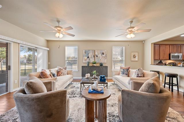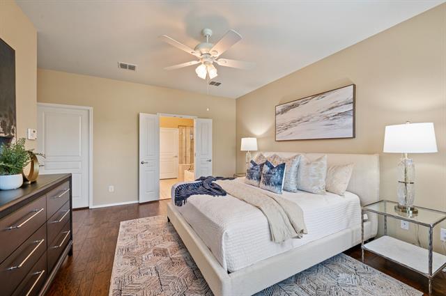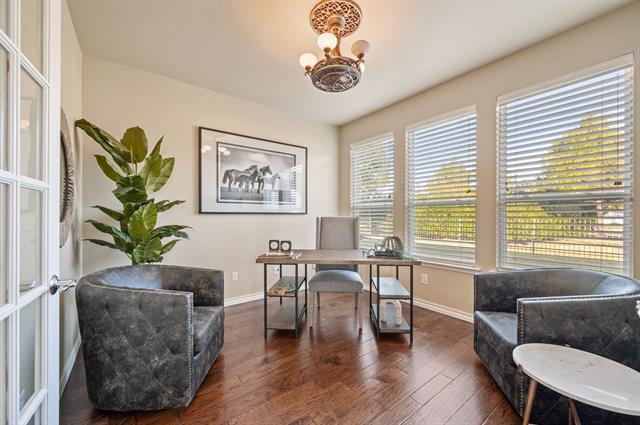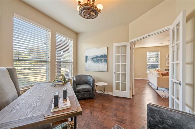 Don’t miss this rare opportunity to live steps away from the main Amenity Center at 55+ community, Frisco Lakes by Del Webb! Perfectly situated on a corner lot, this property offers an unbeatable combination of comfort, design, and ideal location. Step inside and be greeted by granite countertops, hard wood floors, stainless steel appliances, and double glass sliding doors to an extended outdoor covered patio. Beautiful hardwood flooring flows seamlessly throughout the living spaces, creating warmth and elegance. The large family room is bathed in natural light and the office is at the back of this home offering privacy and a landscaped view. This floorplan was designed for both entertaining and everyday living, with an open flow that makes the home feel bright, spacious, and welcoming. Enjoy the unbeatable location just steps from the ballroom where many Frisco Lakes events happen along with easy access to pools, gym, bocce, tennis, hot tubs, and social rooms. This home has an assumable 2.8% interest rate, which means if buyer puts 195K down, buyer is able to assume the current mortgage, around 260k, at only $1218 per month. This translates to saving over $400 per month at current interest rate.