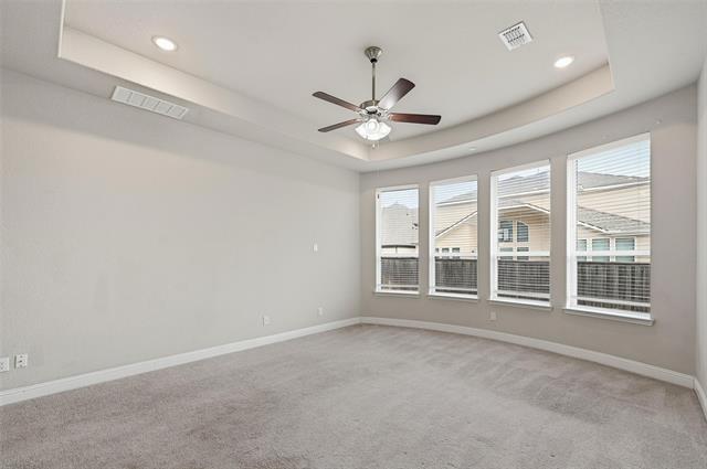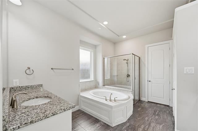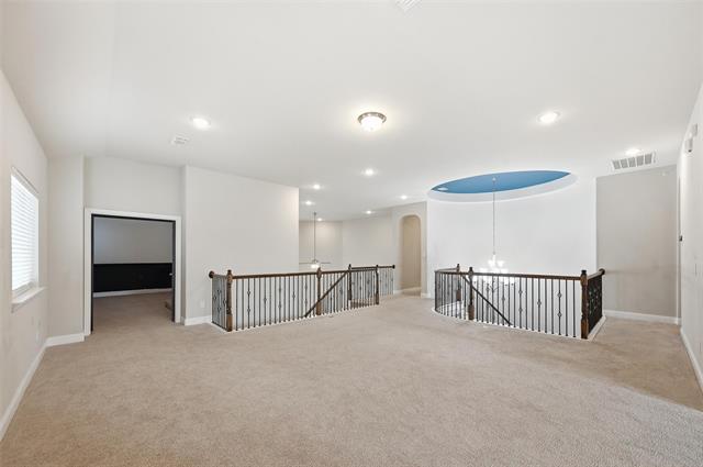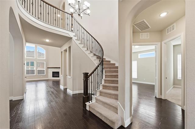 Welcome to this stunning Mediterranean-style stucco home, ideally situated on a desirable corner lot within the exclusive gated Lexington community. Offering over 4,600 square feet of thoughtfully designed living space, this 5-bedroom, 5.1-bath residence seamlessly blends luxury, comfort, and timeless elegance. A grand entry makes an immediate impression with a dramatic curved staircase, setting the stage for the refined interior. The open, light-filled floor plan features dual staircases, rich hardwood floors in the main living areas, and a striking tiled gas fireplace anchoring the spacious living room. The primary suite, conveniently located on the main level, provides a private retreat with a spa-like ensuite bath showcasing a garden tub, separate shower, dual vanities, and an oversized walk-in closet. A guest bedroom and private study are also located downstairs, offering flexibility for visitors or work-from-home needs. At the heart of the home, the chef-inspired kitchen impresses with granite countertops, stainless steel appliances, tile backsplash, an oversized island, walk-in pantry, and abundant cabinetry—perfect for entertaining and everyday living. Upstairs, enjoy three generously sized bedrooms, a large recreation or family room, and a dedicated media room ideal for movie nights and relaxation. Additional highlights include a 3-car split garage with epoxy-finished floors and a large covered patio complete with a gas line for grilling and outdoor gatherings. Located within highly acclaimed Frisco ISD, the gated Lexington community offers resort-style amenities including a clubhouse, swimming pool, park, and playground. Conveniently close to top-rated schools, shopping, dining, and major highways, this exceptional home delivers the perfect balance of luxury living and everyday convenience. **To help visualize this home’s and to highlight its potential, virtual furnishings may have been added to photos found in this listing.**