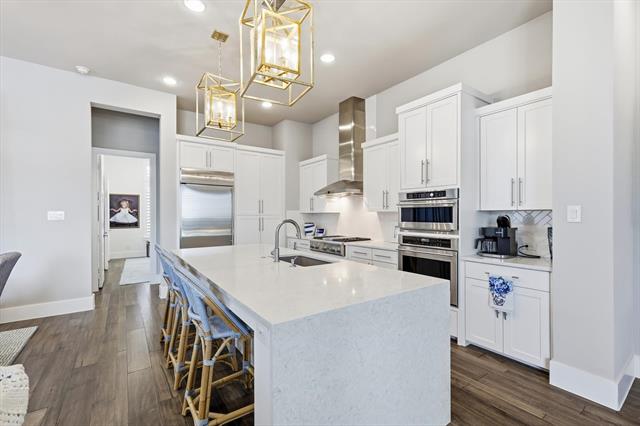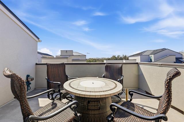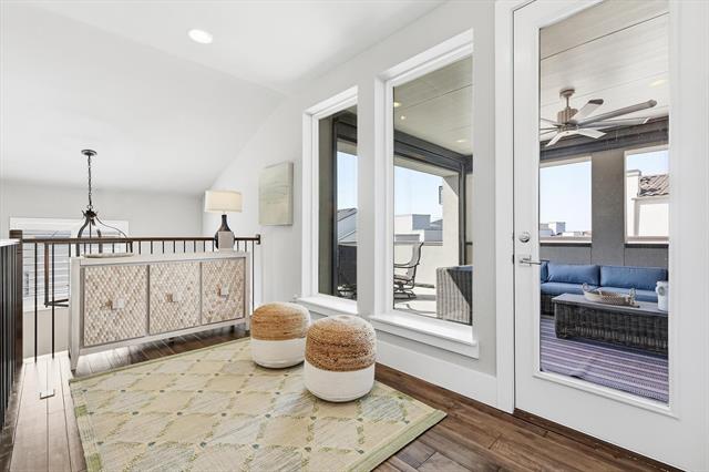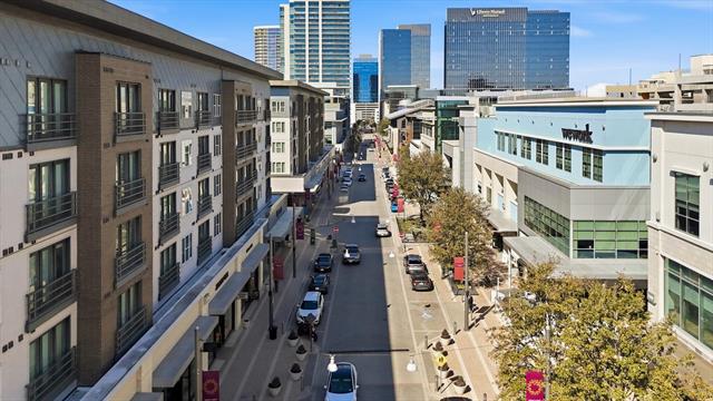 Modern sophistication meets effortless urban living in this architecturally striking three-story residence just steps from Legacy West’s premier shopping and dining. Designed with elevated custom details throughout, the home showcases a dramatic waterfall-edge kitchen island, wine refrigerator, rich wood flooring, plantation shutters, seamless glass shower enclosures, and designer tile selections that create a refined, contemporary aesthetic. Even the garage reflects thoughtful upgrades with sleek RaceDeck flooring. The flexible first floor features two private bedrooms, each with its own ensuite bath, along with a built-in office space ideal for today’s work-from-home lifestyle. The second floor is the heart of the home, an open, light-filled living space where the designer kitchen flows seamlessly into the dining and living areas. Multi-panel glass sliders extend the space onto a large covered deck, delivering true indoor-outdoor living. The serene primary suite is also located on this level, offering both privacy and convenience. On the third floor, a spacious loft opens to a second elevated deck, the perfect setting for sunset views and evening gatherings. Both upper-level decks are equipped with electric shades, providing privacy and protection at the touch of a button. A fenced side yard with low-maintenance turf adds an additional outdoor retreat. Located in Plano ISD with easy access to Highway 121 and the Dallas North Tollway, this residence offers a rare blend of lock-and-leave convenience, luxury design, and walkable lifestyle.