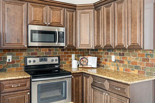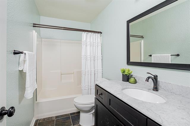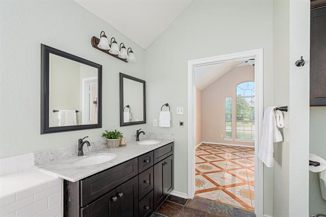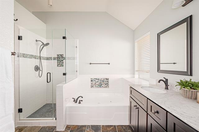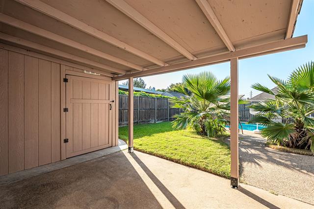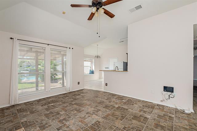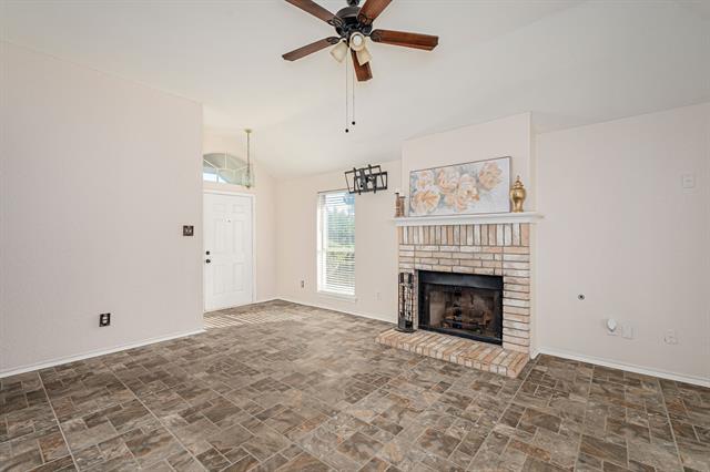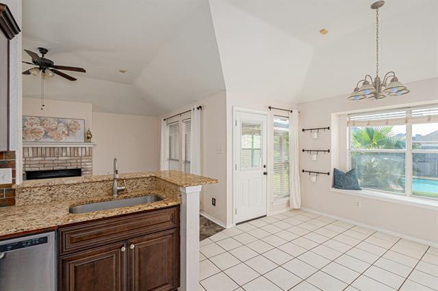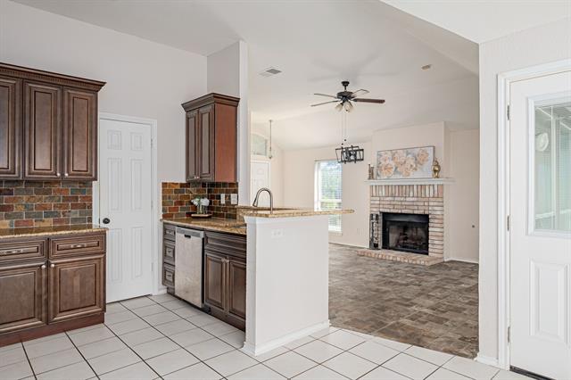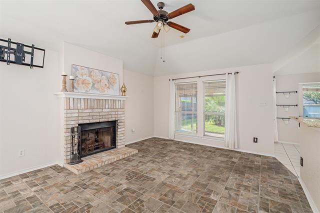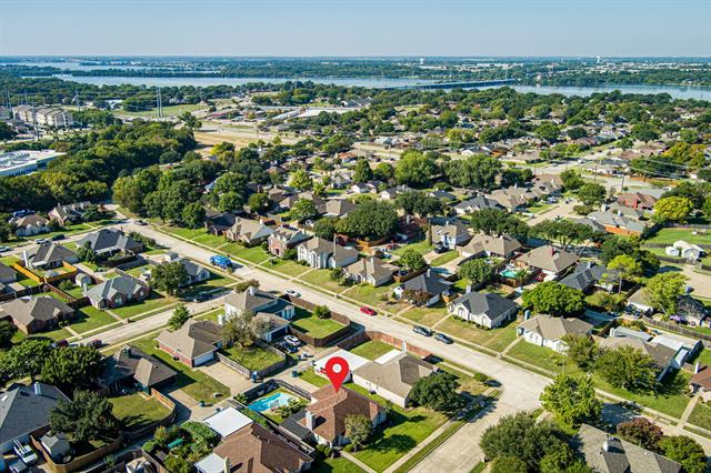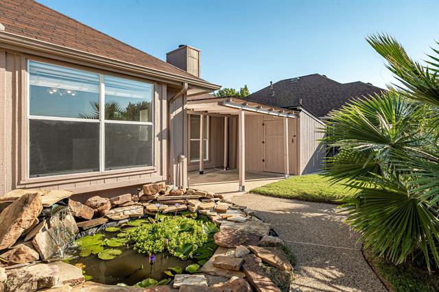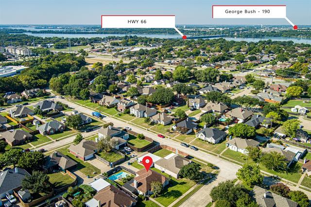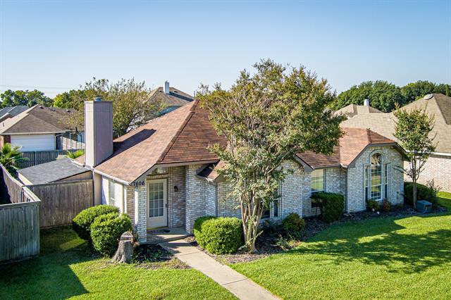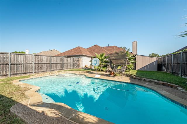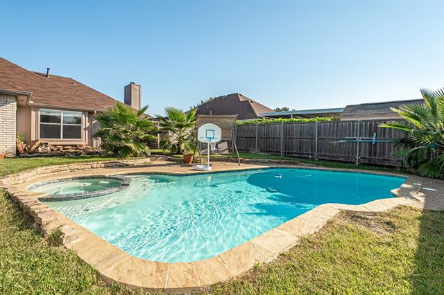 Welcome to your new home! This appealing 3-bedroom, 2-bath, single-level brick residence offers 1,297 SqFt of comfortable living. Step into the spacious living room where vaulted ceilings soar above the cozy brick fireplace with gas starter. The updated kitchen is a chef's delight, featuring Natural Stone Granite Type Counters, dark brown cabinetry, tasteful backsplash, stainless steel appliances, and a Walk-in Pantry. Relax and unwind in the private Primary Suite. The Ensuite Bath offers luxury with Dual Sinks and a coveted Jetted Tub. The resort lifestyle awaits you outside! The private, fenced backyard features a pool complete with an attached, in-ground hot tub and a patio area—perfect for entertaining. Enjoy peace of mind with a 2-car attached garage, central heating and cooling, and location within the desirable Garland ISD. This home offers great location with close proximity to schools, shopping and 190 HWY. Don't miss this opportunity for a beautifully updated home with a gorgeous backyard!