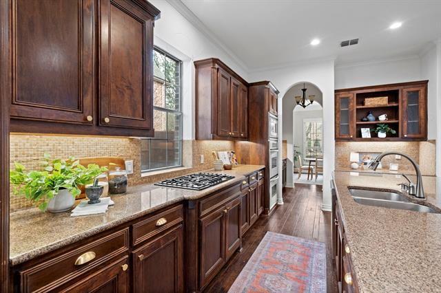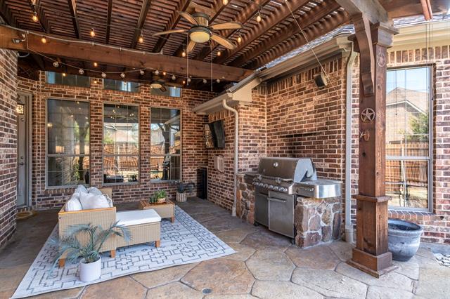 Step inside this beautifully updated home, perfectly positioned on an exceptional corner lot in the sought-after Estates on Legacy community and zoned for highly rated Frisco ISD. Upon entering, you’ll be greeted by a sunlit two story foyer, where thoughtful updates and a resort-style backyard set the tone for stylish living and everyday convenience. At the heart of the home, the open concept living room flows seamlessly into the kitchen and dining spaces, featuring a stunning floor-to-ceiling fireplace, custom shelving, and views of the spacious backyard. The kitchen blends function and design with a built-in wet bar or coffee nook, walk-in pantry, stainless steel appliances, gas cooktop, and double ovens - ideal for both daily living and entertaining. The primary suite offers updated flooring, a redesigned fireplace, and a cozy sitting nook, complemented by a spa-like bath with dual vanities and a generous walk-in closet. Upstairs you'll find three well appointed bedrooms, a large recreational room, a dedicated movie room, and a versatile bonus space with two built-in workstations - perfect for work, study, and play. Unwind in the resort-style backyard, complete with a sparkling pool, spa, fully equipped outdoor kitchen, fire pit, and a spacious wraparound lawn, perfect for relaxing or entertaining. Residents of Estates on Legacy enjoy top-tier amenities, including access to a community pool, tennis courts, pickleball courts, and the fitness center at Lakes Tennis. With award-winning schools, fabulous shopping and dining just 10 minutes from The Shops at Legacy and 5 minutes from The Star, plus a neighborhood fishing pond for slow weekends outdoors, this community truly offers it all.
